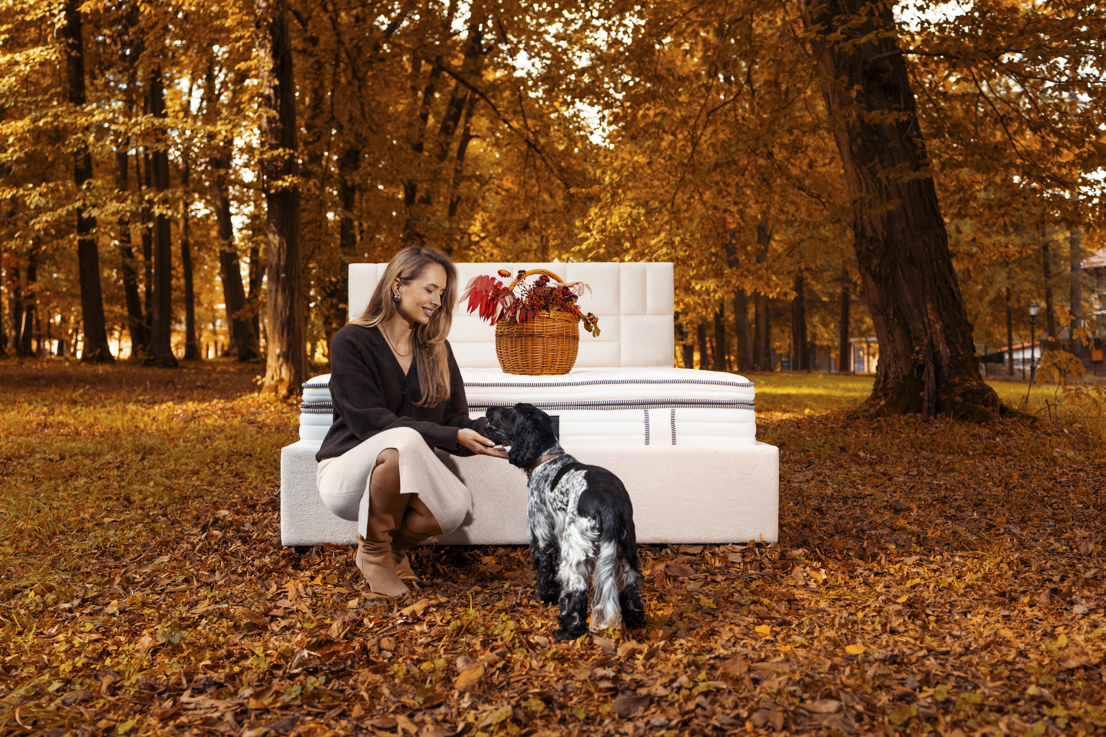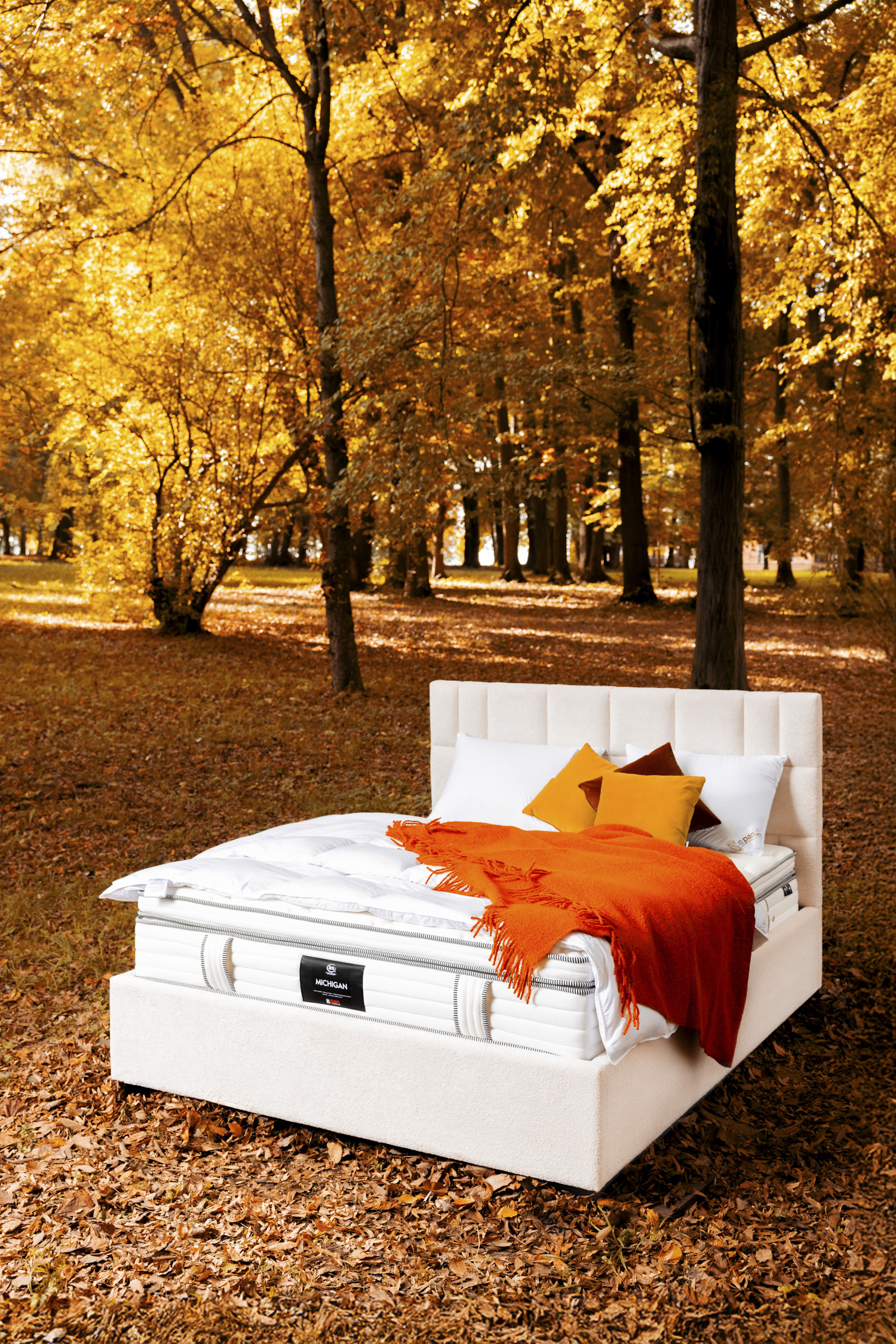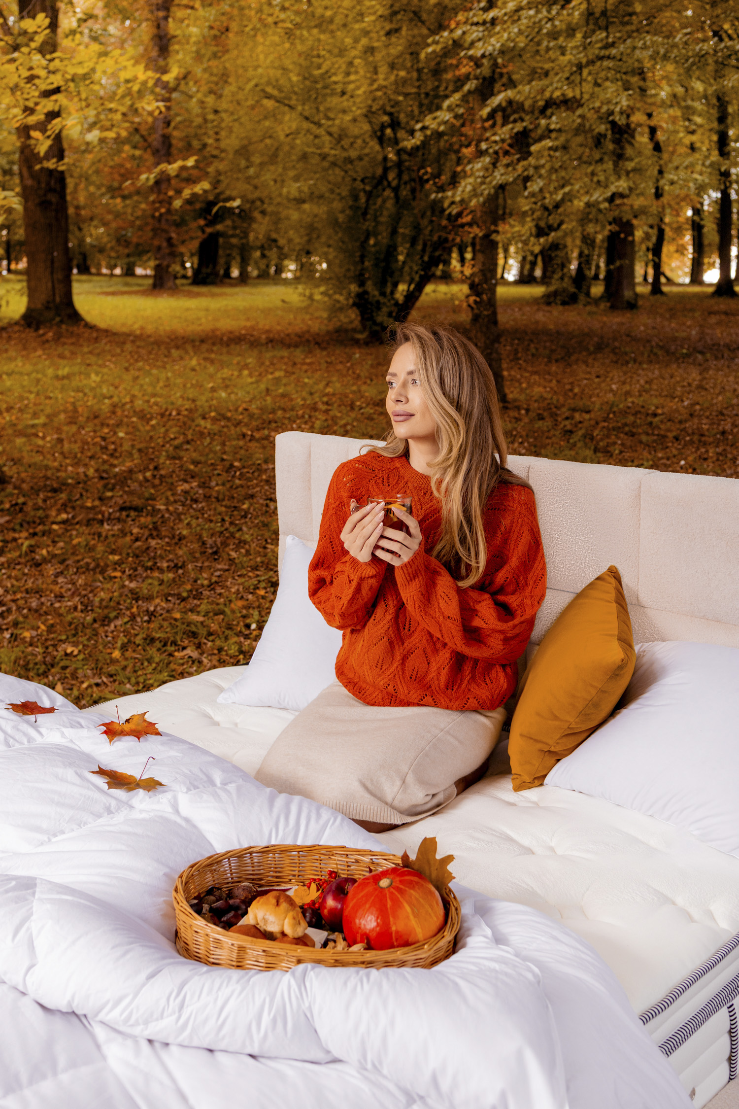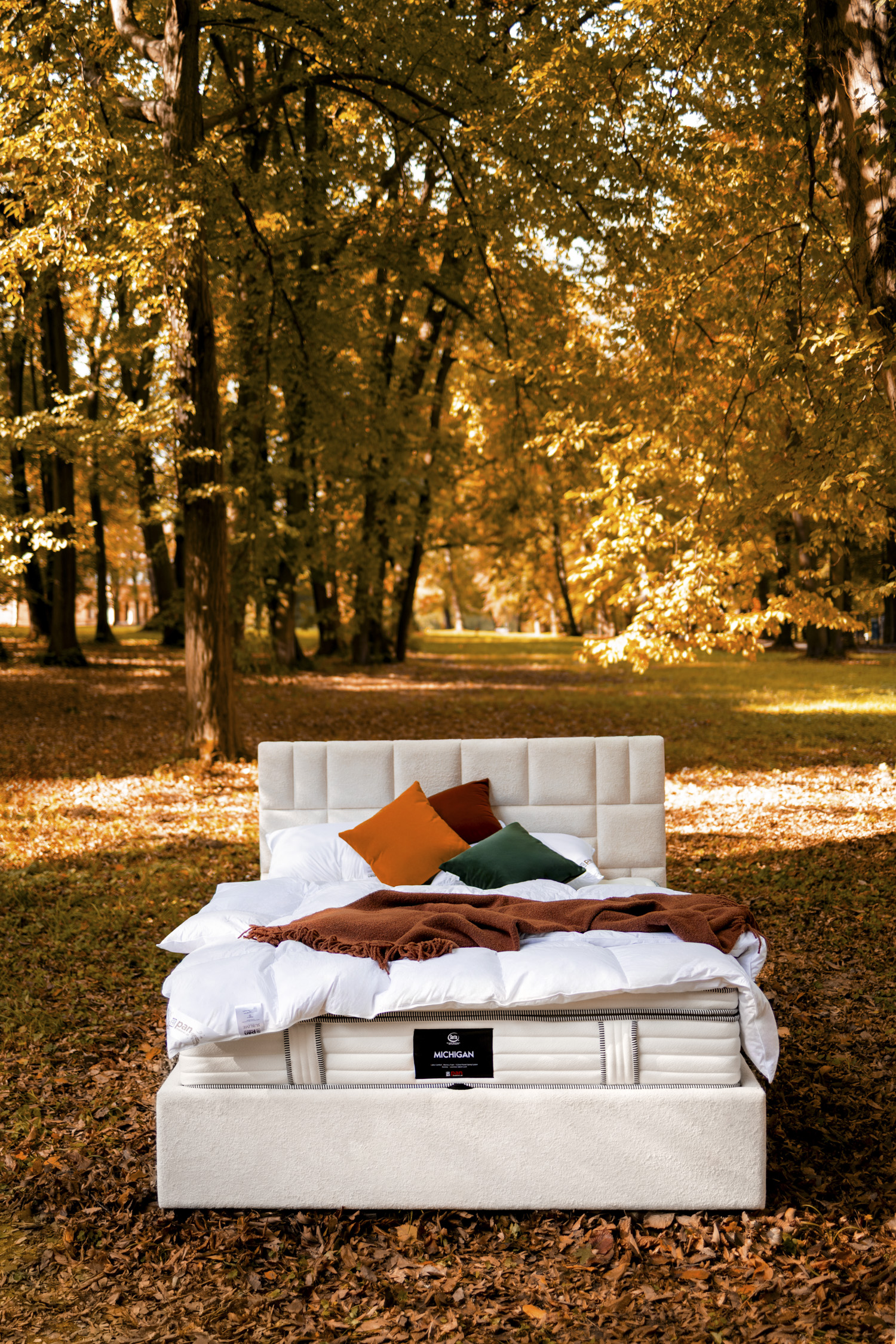 Przygotowania do takiego projektu fotograficznego to proces, który jest połączeniem dobrej organizacji, planowania oraz kreatywności. Trzeba było znaleźć idealne miejsce, przewieźć łóżko i dopasować całą aranżację. W centrum kadru pojawił się oczywiście bohater kadru – łóżko z materacem, które aranżowaliśmy na kilka sposobów. Pokazaliśmy je wyłącznie z materacem, z białą pościelą , a także w dalszej części zdjęć – aranżowaliśmy łózko, dodając pledy, koce, kolorowe poduszki, liście czy wiklinowy kosz. Sceneria musiała być dopracowana w każdym szczególe.