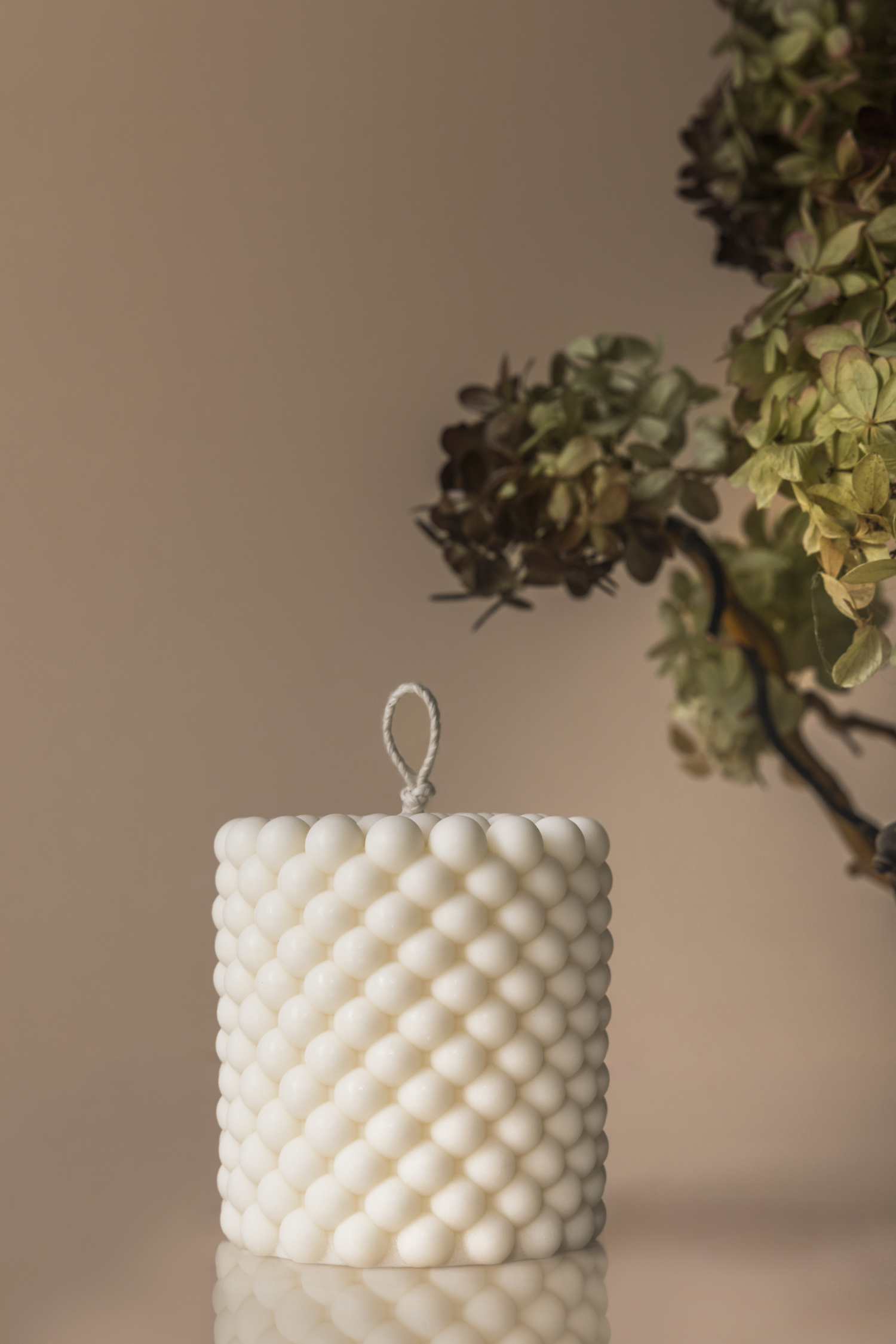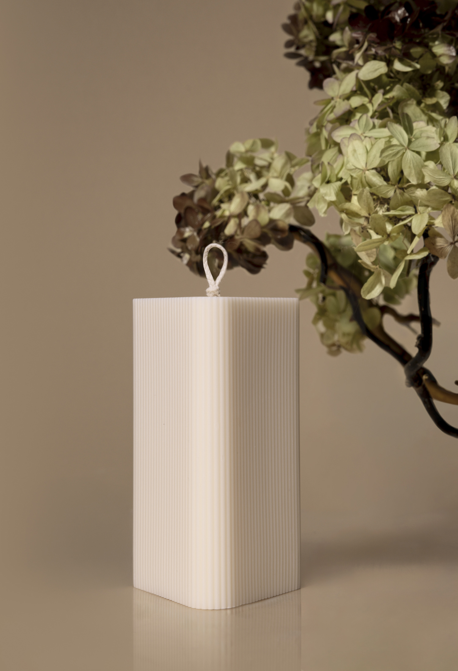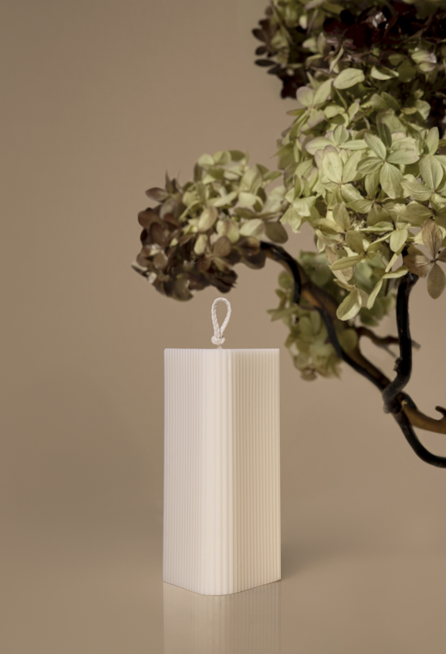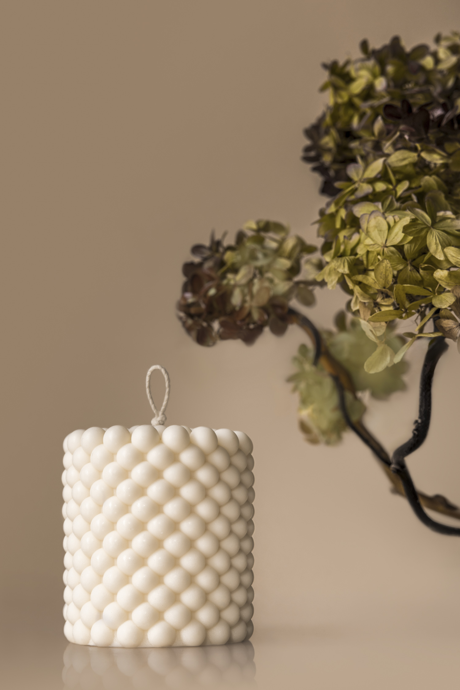 Fotografia aranżowana świec to temat, który potrafi wciągnąć bez reszty. Zwłaszcza wtedy, gdy przed obiektywem stają wyjątkowe produkty, jak świece geometryczne marki Corina Candle. To właśnie one stały się bohaterkami mojej ostatniej sesji zdjęciowej. Cały projekt obejmował dwa etapy – klasyczne zdjęcia do sklepów online (czyli tzw. pack shoty na białym tle) oraz kreatywną część aranżowaną, na której chciałabym się skupić. Produkty, które otrzymałam, różniły się wielkością, kształtem i rzeźbieniem, dlatego zależało mi, by pokazać ich indywidualny charakter. Inspiracją do całej aranżacji była minimalistyczna kompozycja z zasuszoną hortensją, dlatego wcześniej zebrałam kwiaty hortensji bukietowej i zasuszyłam je. Później nadałam im cieplejszy ton przy pomocy brązowego sprayu florystycznego, aby idealnie wpasowały się w ciepłe tło sesji. Kwiaty przykleiłam gorącym klejem do poskręcanych gałązek wierzby, tworząc naturalne, organiczne formy. Całość dopełniłam taflą pleksi, dzięki której kompozycja zyskała delikatne, lustrzane odbicie.