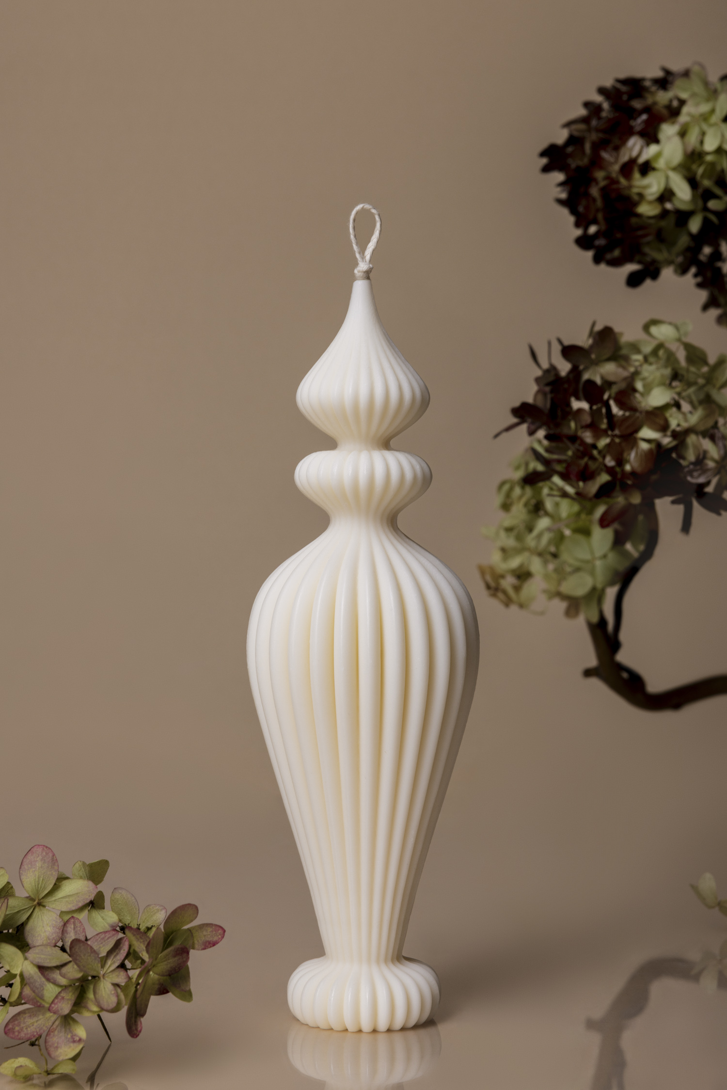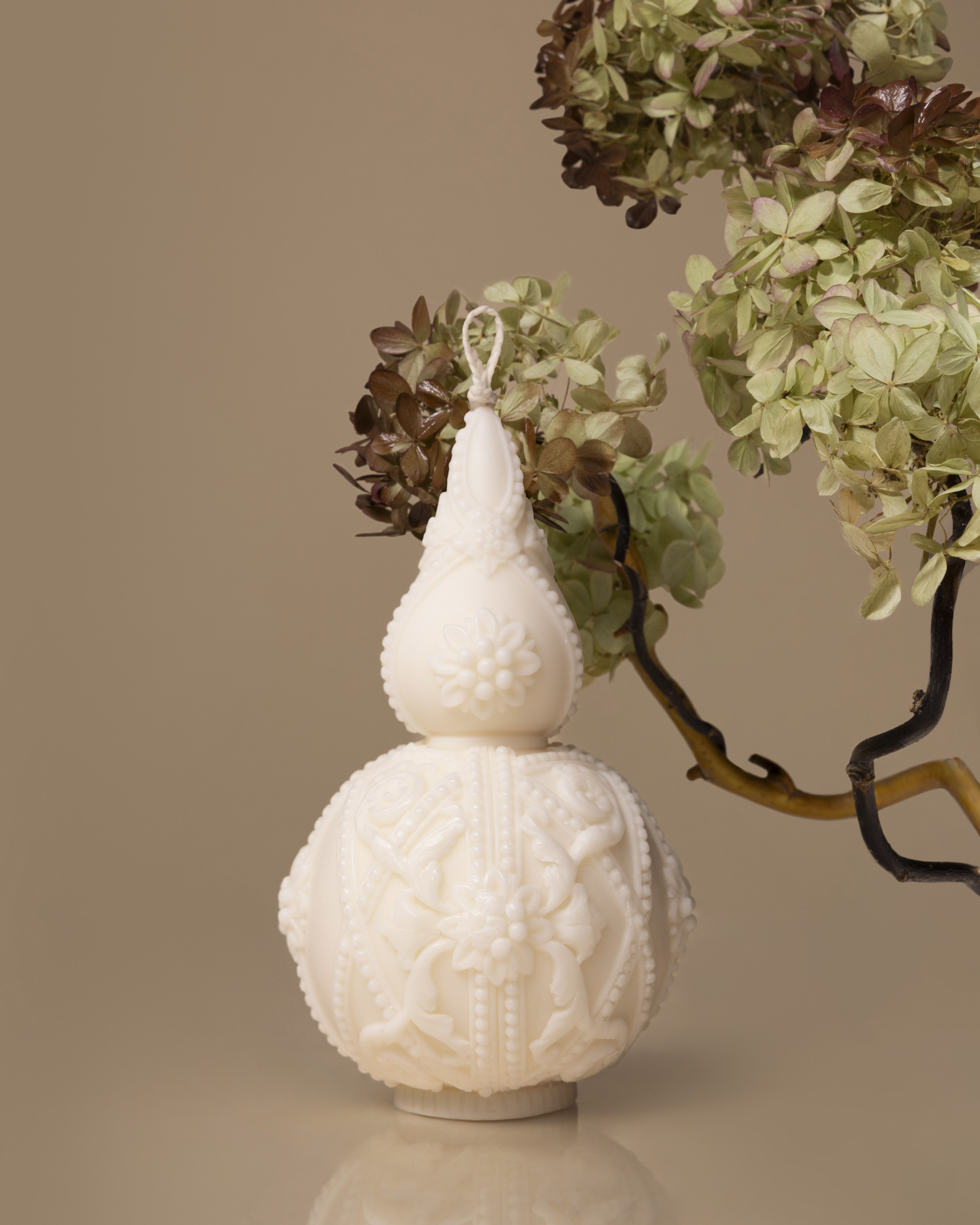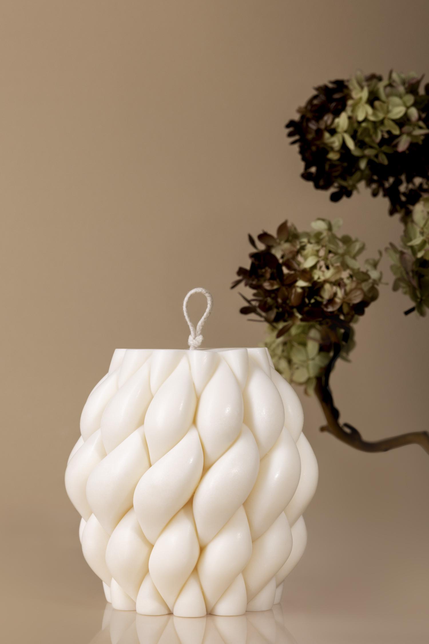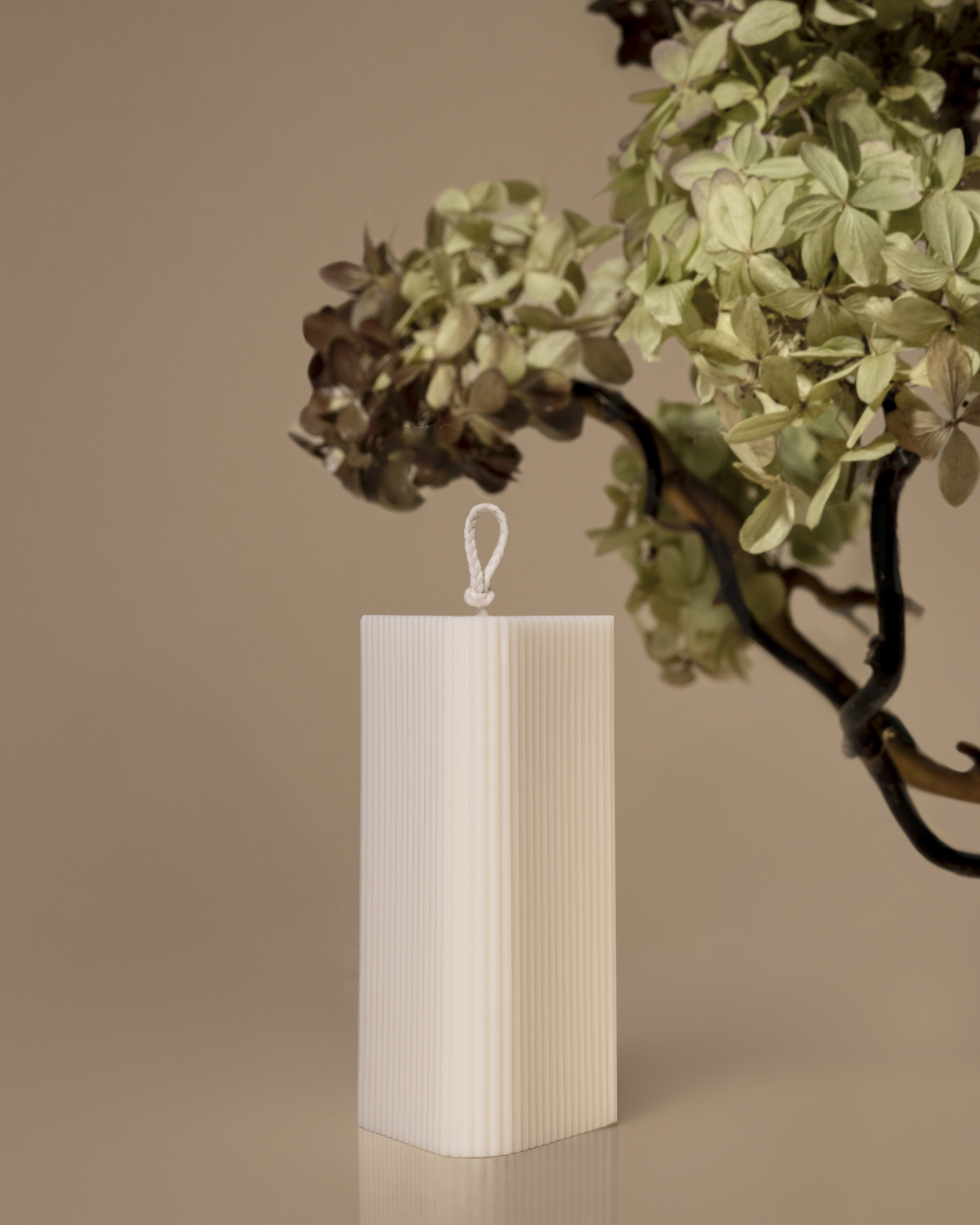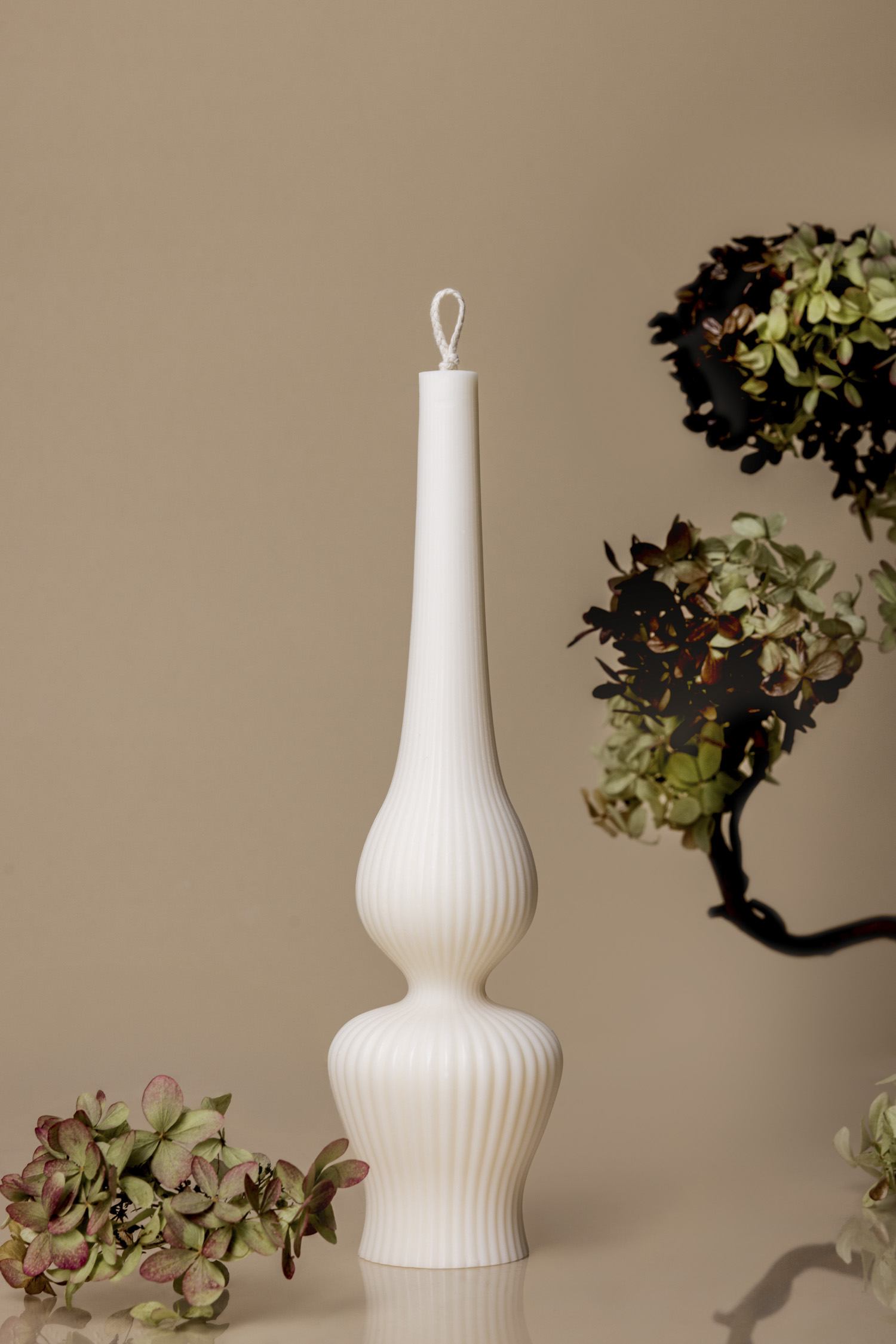 Fotografia aranżowana świec to temat, który potrafi wciągnąć bez reszty. Zwłaszcza wtedy, gdy przed obiektywem stają wyjątkowe produkty, jak świece geometryczne marki Corina Candle. To właśnie one stały się bohaterkami mojej ostatniej sesji zdjęciowej. Cały projekt obejmował dwa etapy – klasyczne zdjęcia do sklepów online (czyli tzw. pack shoty na białym tle) oraz kreatywną część aranżowaną, na której chciałabym się skupić. Produkty, które otrzymałam, różniły się wielkością, kształtem i rzeźbieniem, dlatego zależało mi, by pokazać ich indywidualny charakter. Inspiracją do całej aranżacji była minimalistyczna kompozycja z zasuszoną hortensją, dlatego wcześniej zebrałam kwiaty hortensji bukietowej i zasuszyłam je. Później nadałam im cieplejszy ton przy pomocy brązowego sprayu florystycznego, aby idealnie wpasowały się w ciepłe tło sesji. Kwiaty przykleiłam gorącym klejem do poskręcanych gałązek wierzby, tworząc naturalne, organiczne formy. Całość dopełniłam taflą pleksi, dzięki której kompozycja zyskała delikatne, lustrzane odbicie.