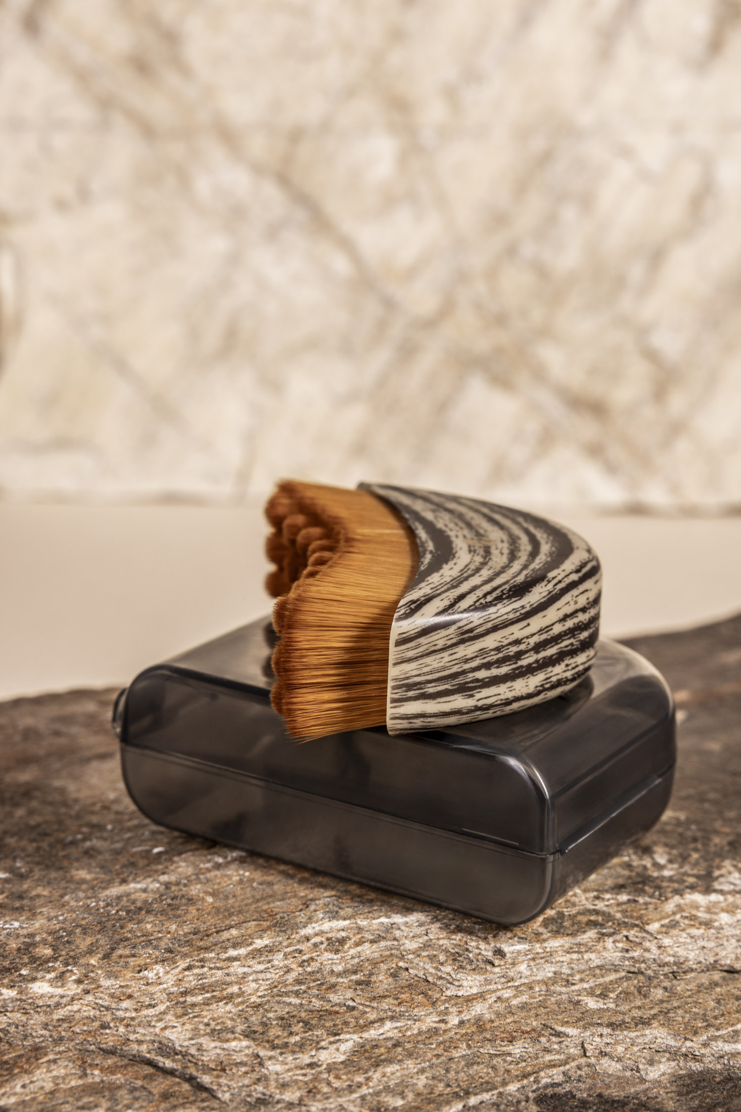 Kolejnym etapem była fotografia aranżowana, która pozwaliła pokazać produkt w szerszym kontekście. Szczoteczkę fotografowałam na kamieniach o wyraźnej, naturalnej fakturze. Ich struktura dobrze współgrała z uchwytem szczoteczki i podkreślała jej charakter. Do części kadrów dodałam zielone liście. Ten prosty zabieg nadał zdjęciom spokojny, spa-klimat. Całość stała się bardziej zmysłowa i przyjemna w odbiorze. Taka fotografia produktowa szczoteczki do makijażu Kobido buduje emocje i sprawia, że odbiorca łatwiej wyobraża sobie codzienny rytuał pielęgnacyjny.