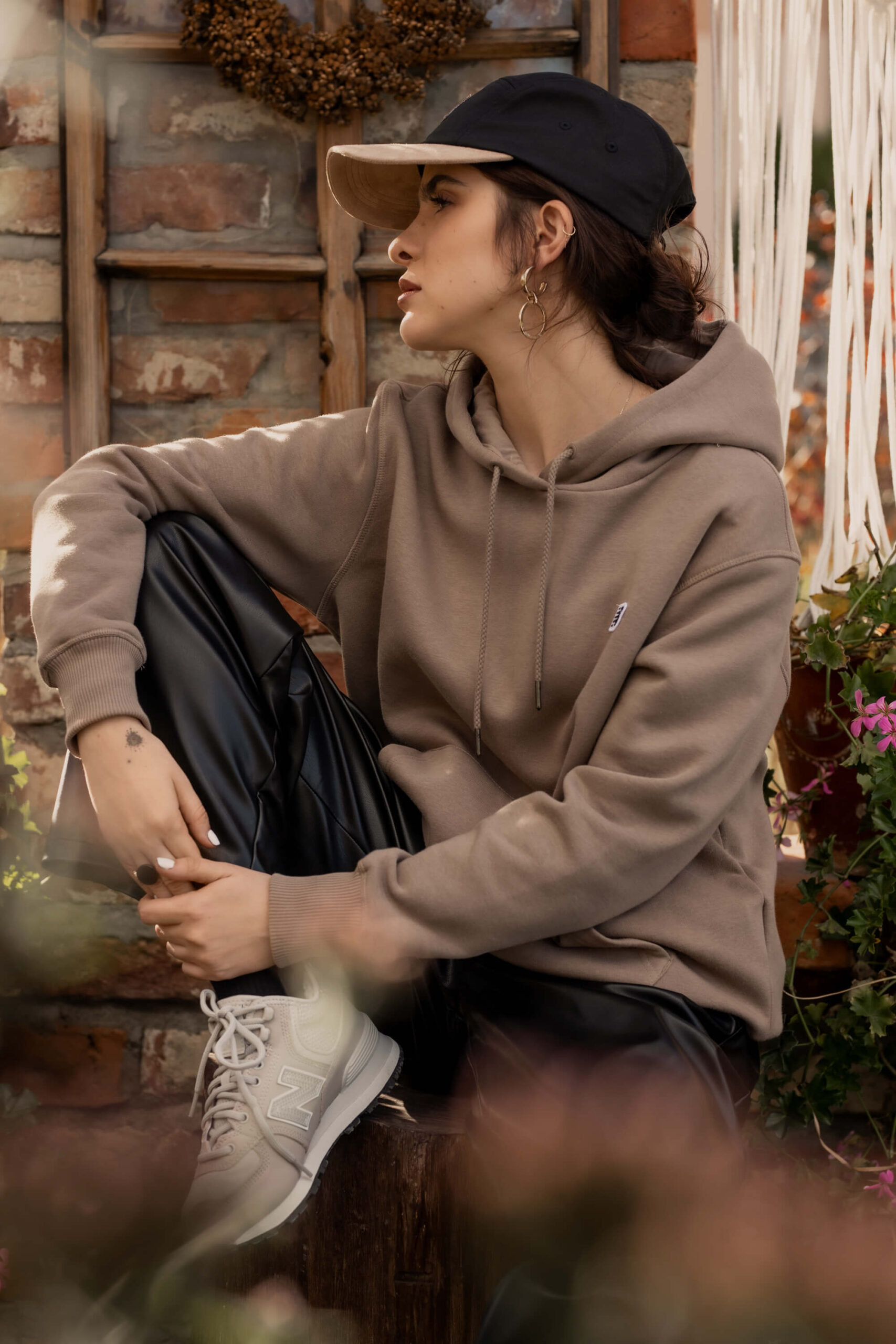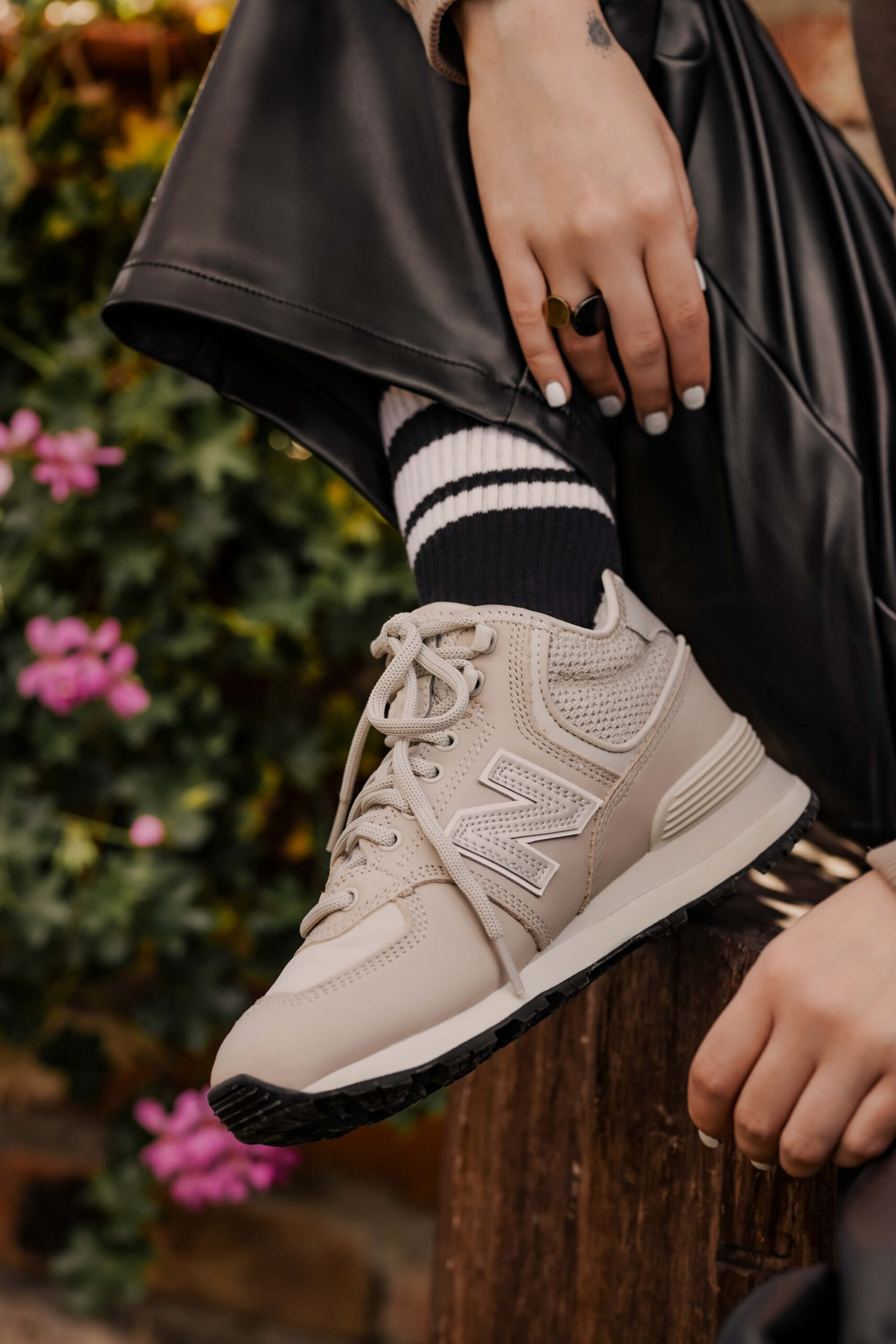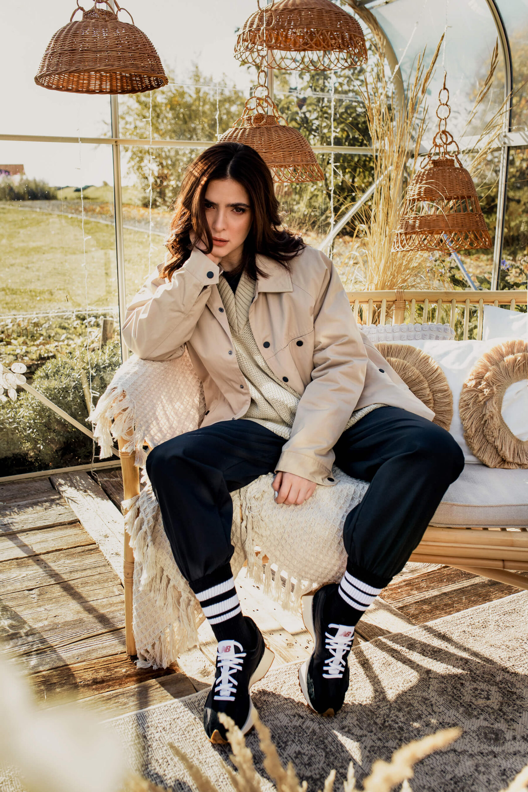 W szklarni zaczęłyśmy naszą sesję i tam wykonałyśmy kilka stylizacji bazujących na odzieży i obuwiu NB. Następnie przeniosłyśmy się na zewnątrz. Naszym tłem był ogród, ściany z cegły i drewna oraz budynek wykończony drewnianymi drzwiami pomalowanymi na biało.