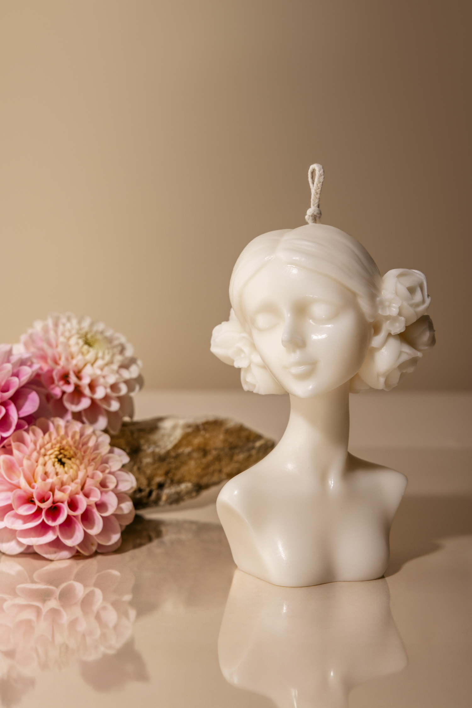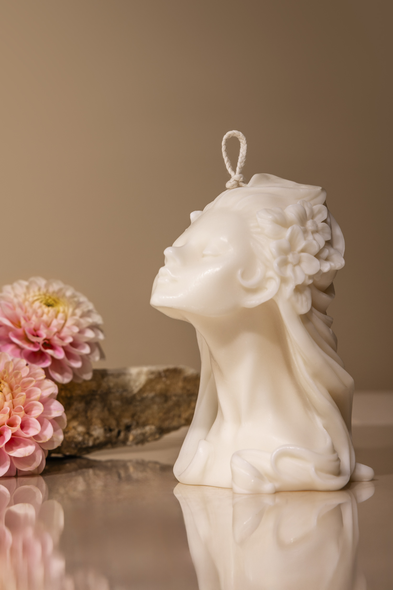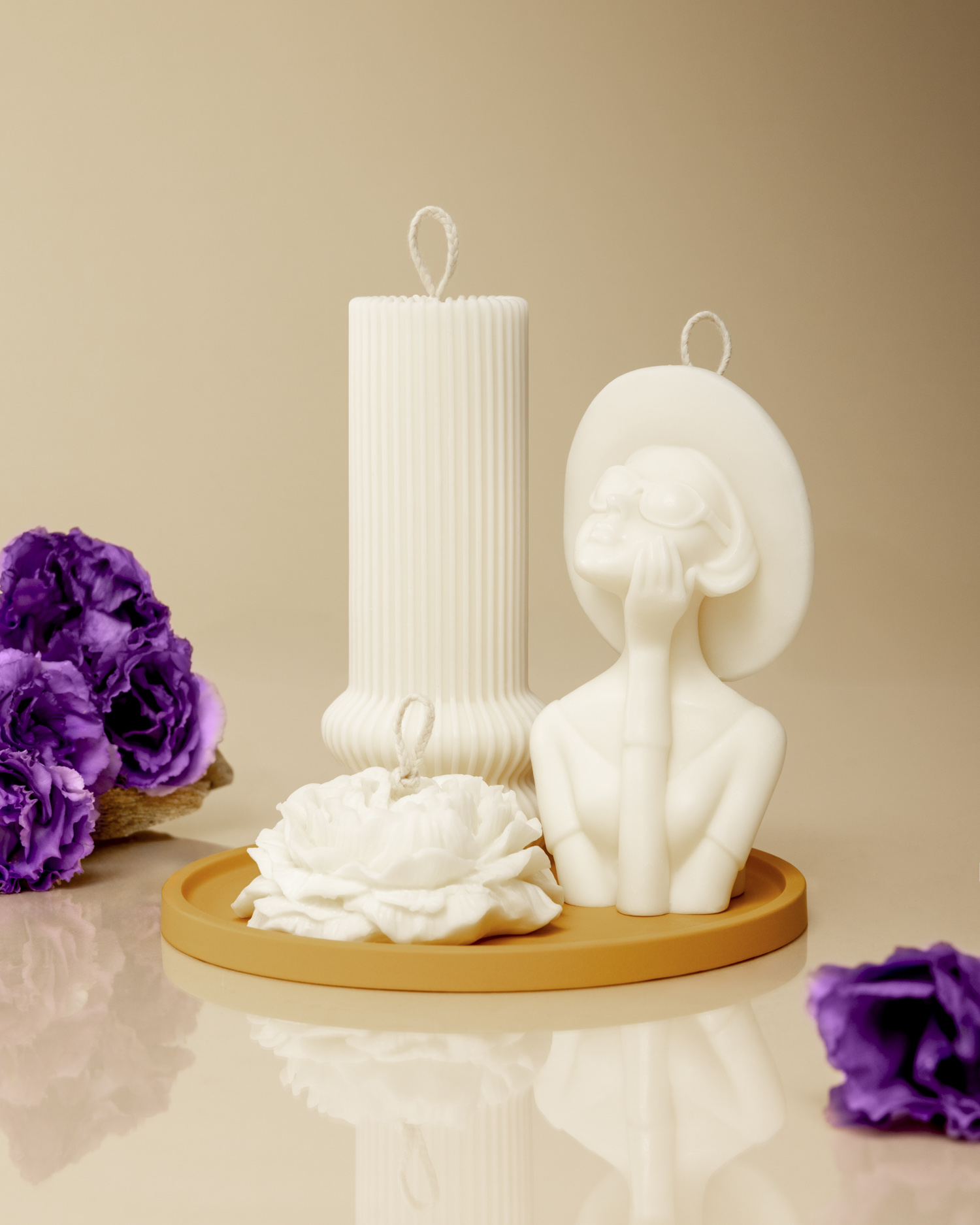 Każda kategoria świec wymagała innego podejścia. Dla świec geometrycznych i zestawów stworzyłam aranżację na brązowym tle z dodatkiem suszonych hortensji – naturalnych, delikatnych, a przy tym bardzo eleganckich. Znaki zodiaku, świece antyczne i religijne sfotografowałam na tle różnych rodzajów kamienia. Ich struktura świetnie podkreśliła charakter produktów. Oddzielna koncepcja powstała też dla zestawów świec – w tej aranżacji główną rolę odegrały żywe kwiaty dalii i trzy różne tace, które dodały ujęciom świeżości.