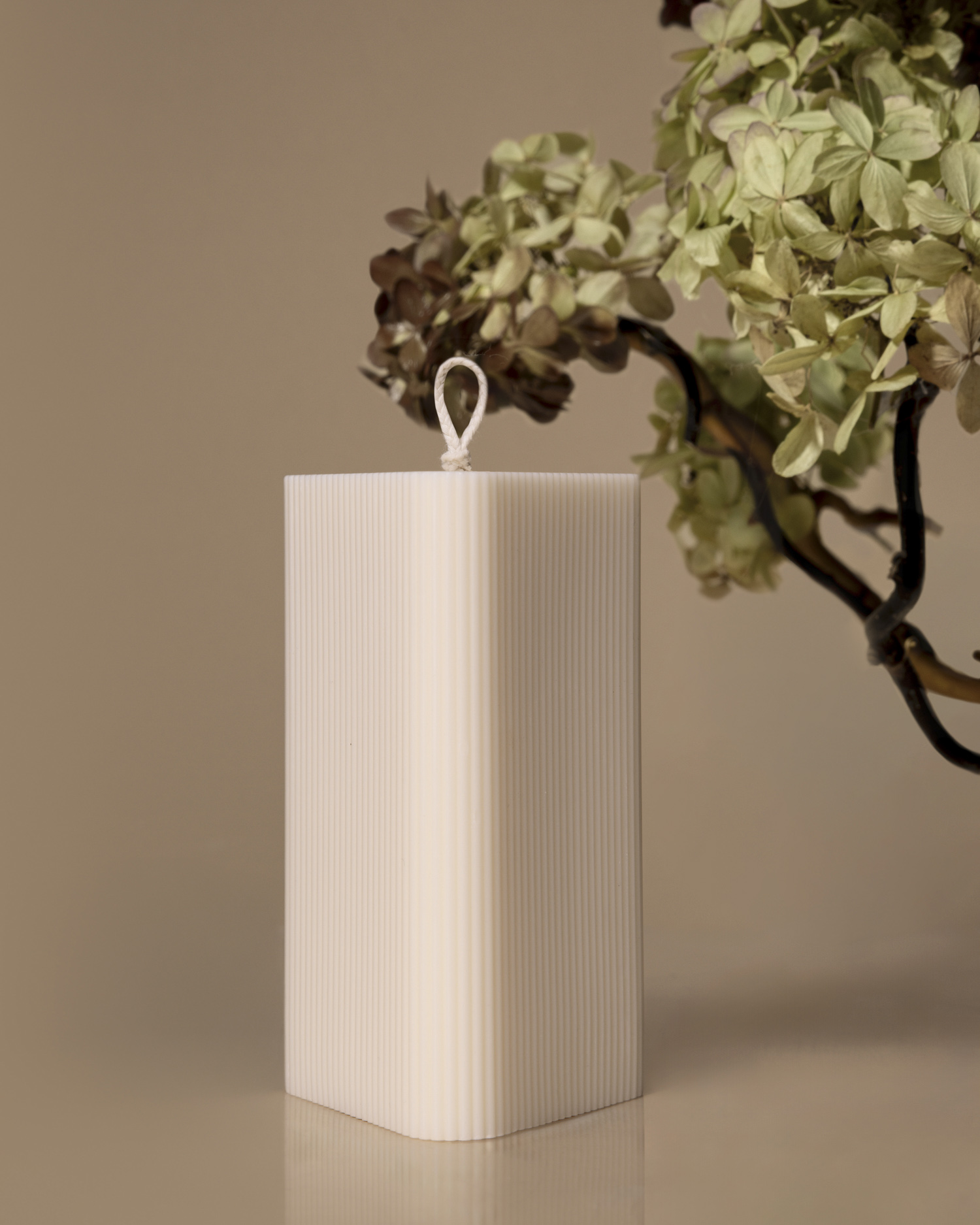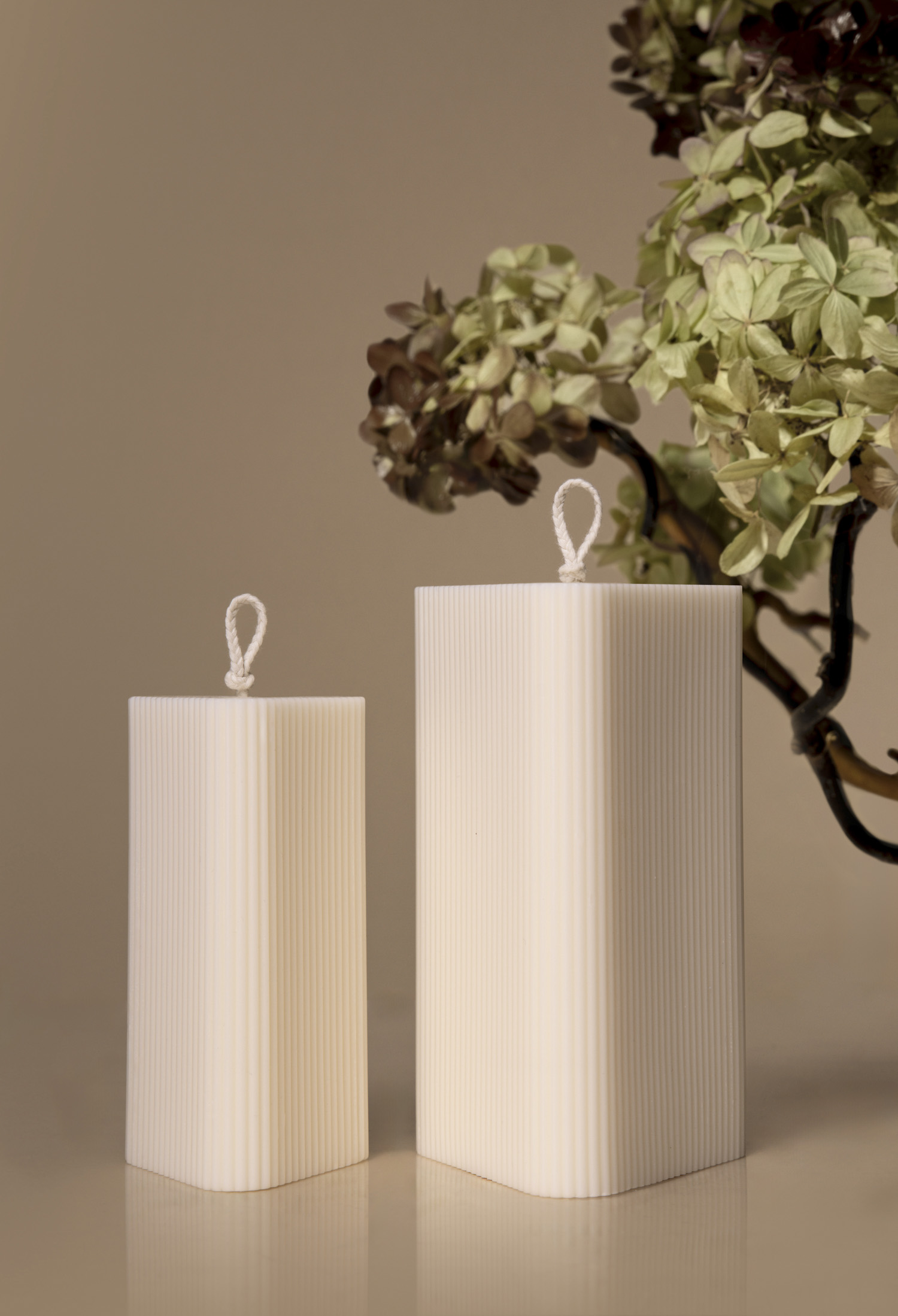 Sesja aranżowana świec dla marki Corina Candles to było prawdziwe fotograficzne wyzwanie, ale też ogromna przyjemność. W ramach projektu przygotowałam aż sześć różnych aranżacji, dopasowanych do kategorii świec. Inspiracje były różnorodne – od suszonych kwiatów hortensji, przez surowy kamień, aż po świeże kwiaty dalii. Całość rozpoczęłam od klasycznych ujęć, czyli fotografii packshot – zdjęć świec na białym tle. To obowiązkowy etap każdej fotografii produktowej świec, który pozwala pokazać detale i kształt produktów w pełnej okazałości. Następnie przygotowałam zdjęcia próbne, tzw. sample, by przedstawić Klientce kierunek dalszych działań.