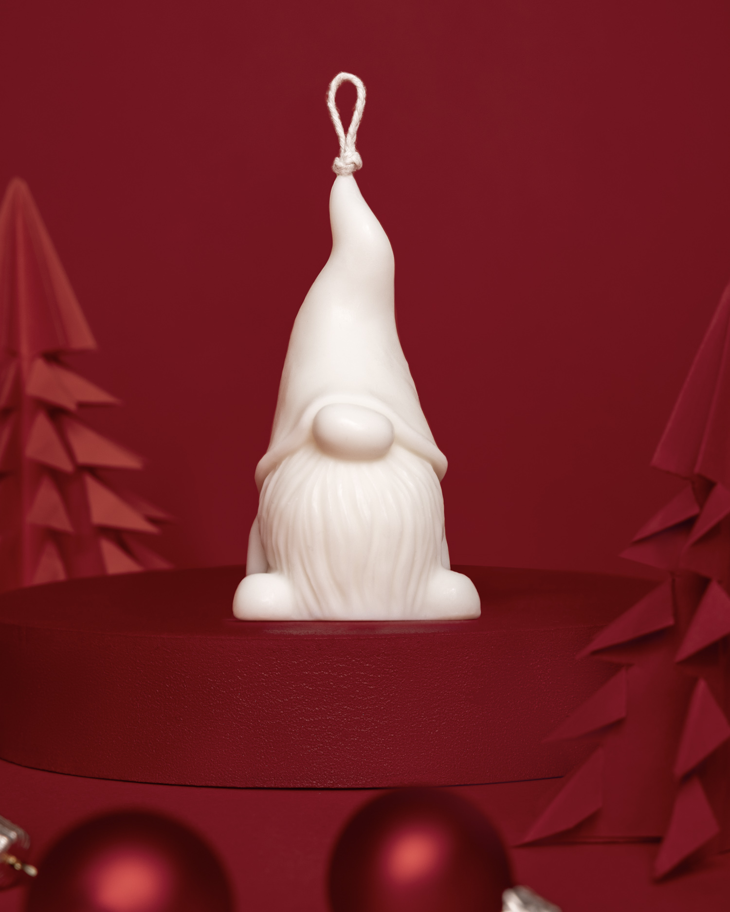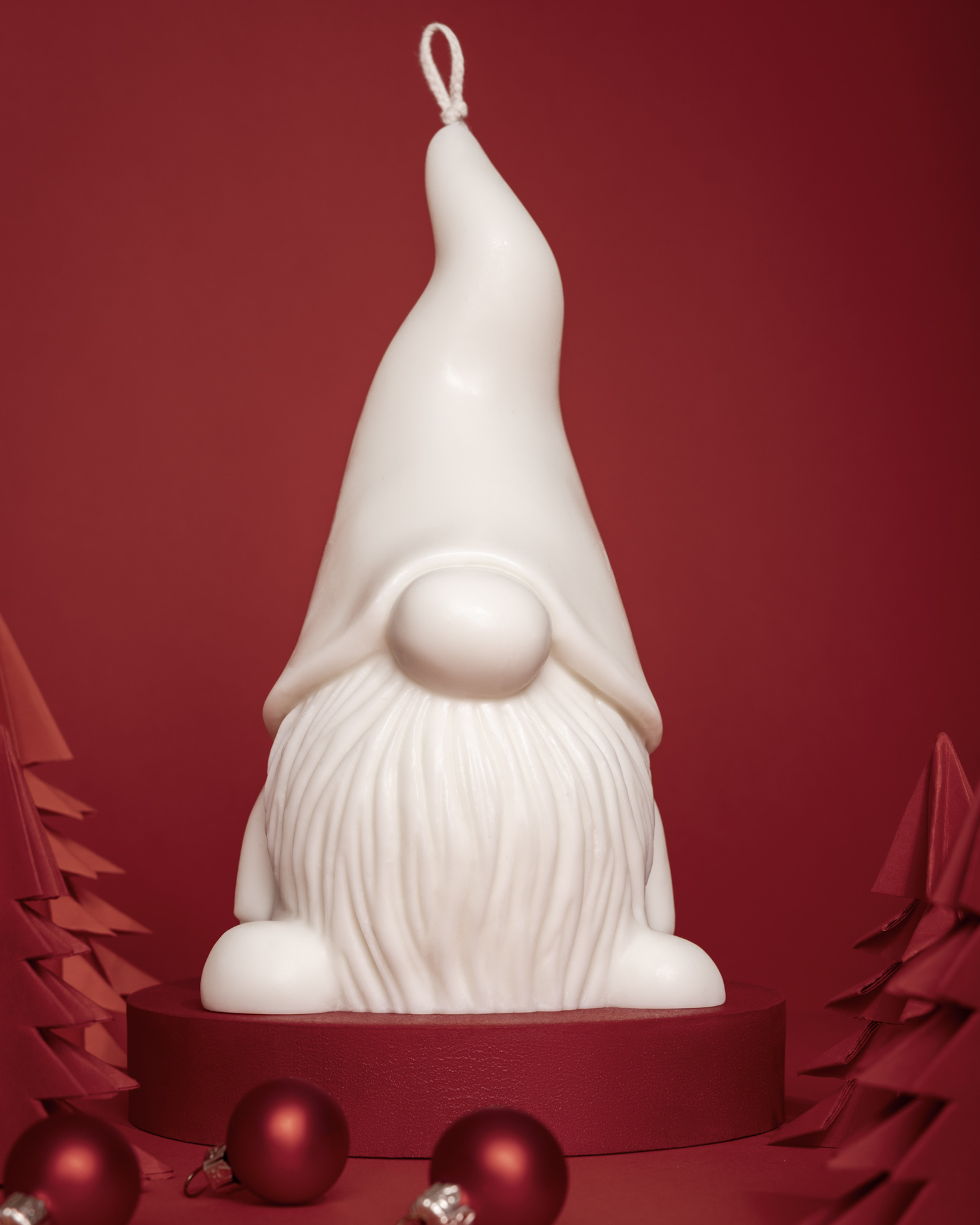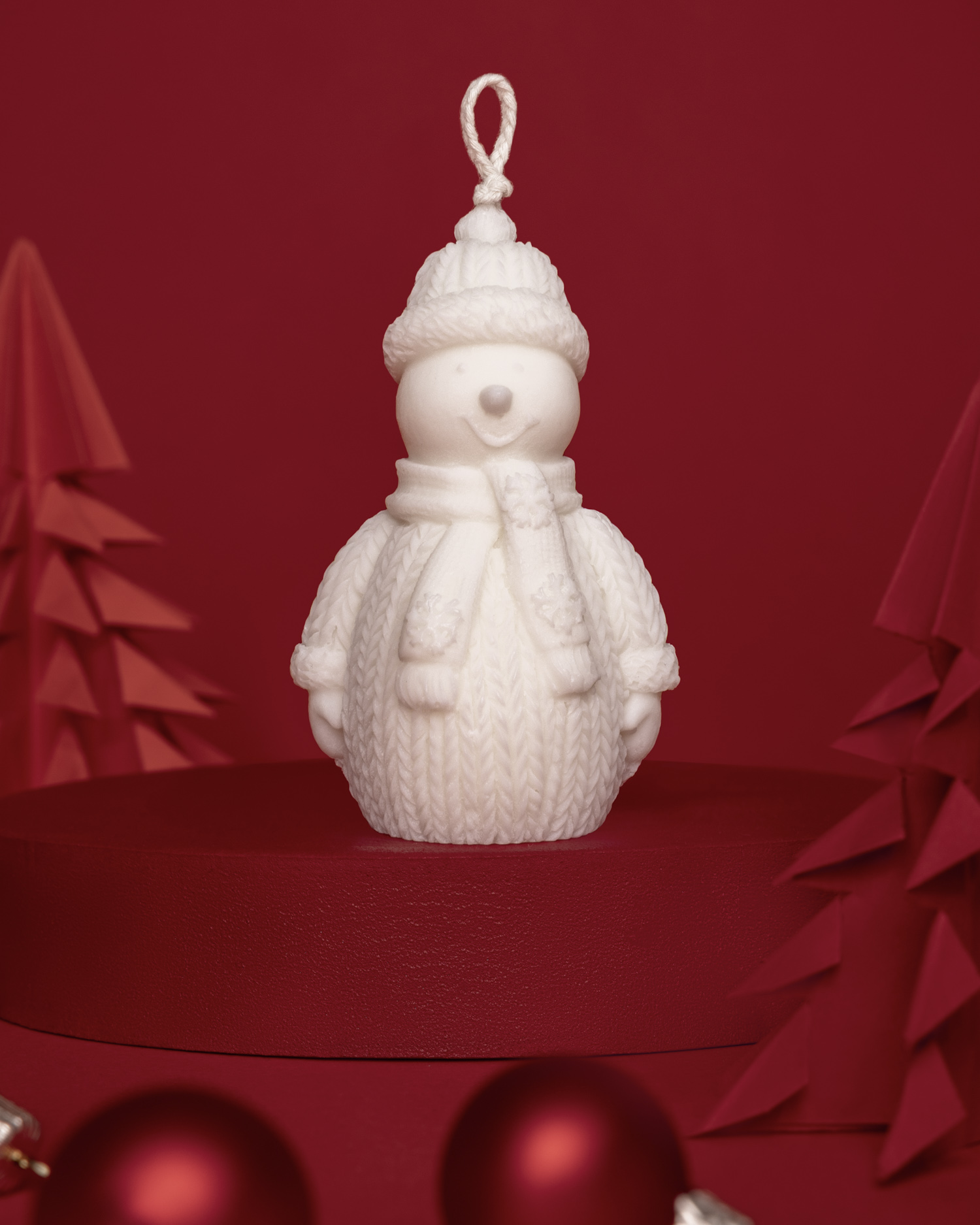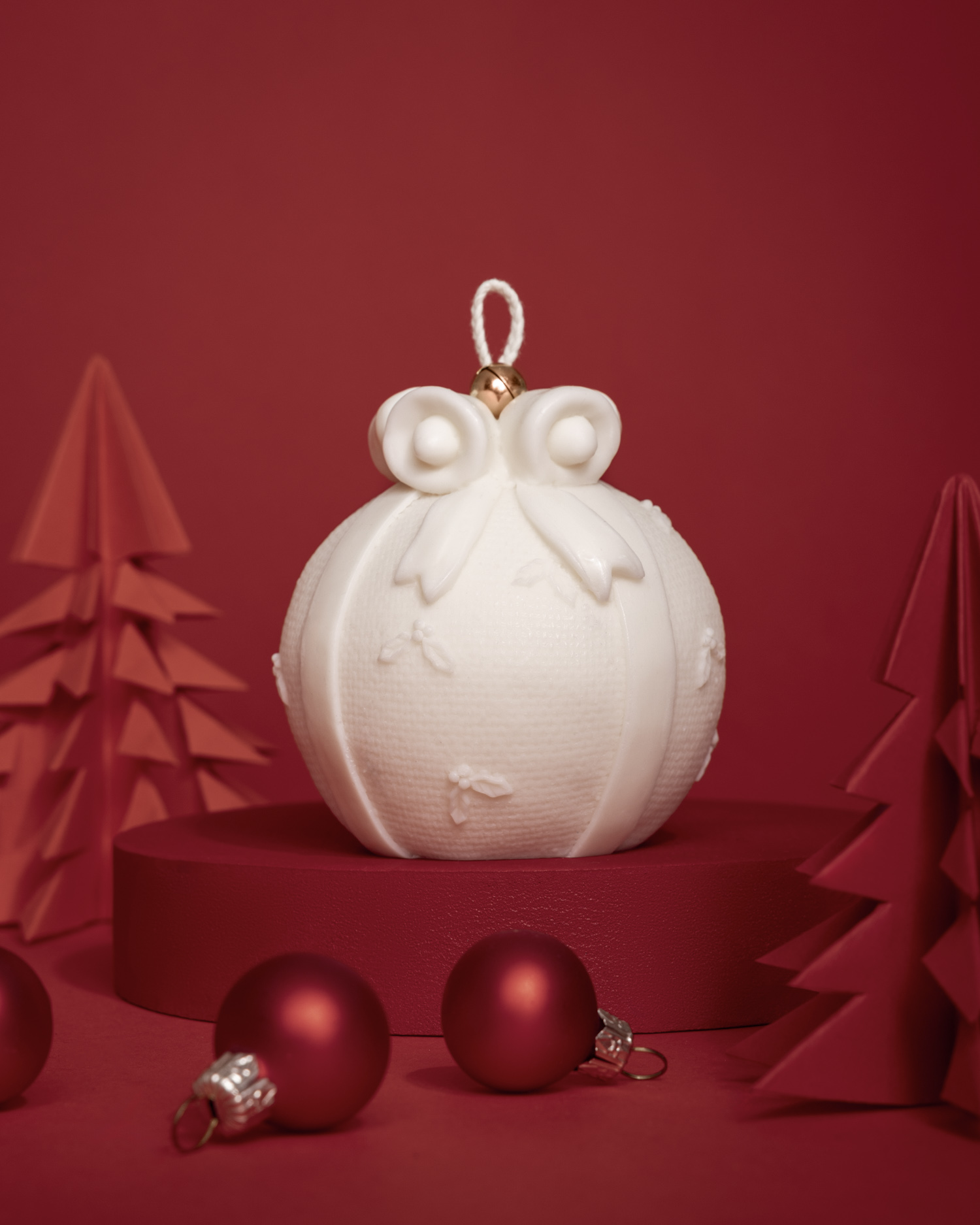 Dla świec bożonarodzeniowych przygotowałam wyjątkową, ciepłą scenę. Czerwone tło, piankowy podest pomalowany własnoręcznie oraz papierowe choinki stworzyły klimat świątecznej magii. To właśnie tu fotografia świec nabrała emocjonalnego charakteru.