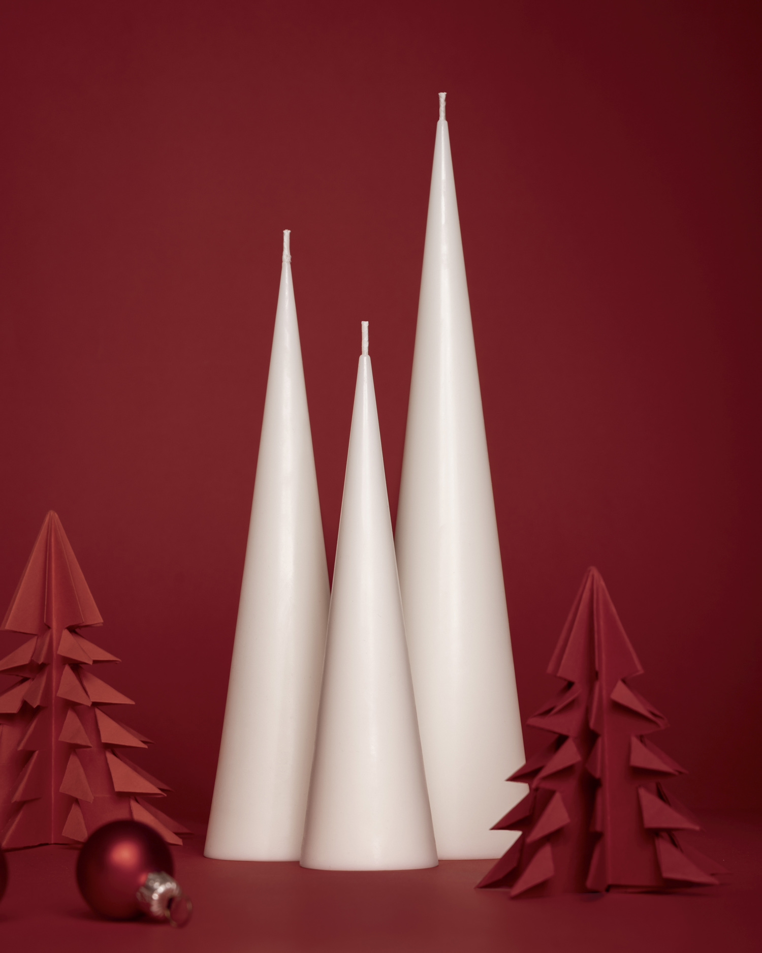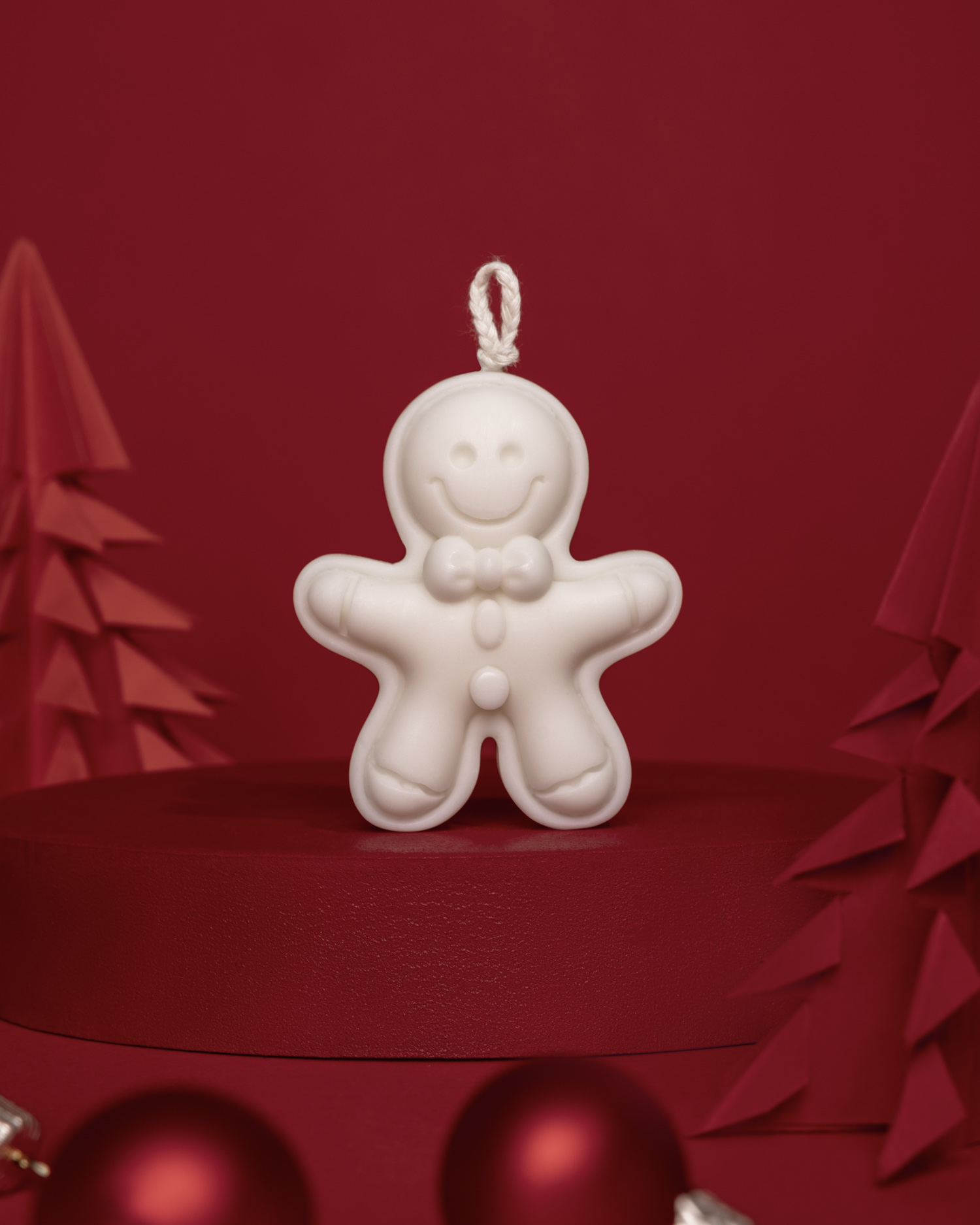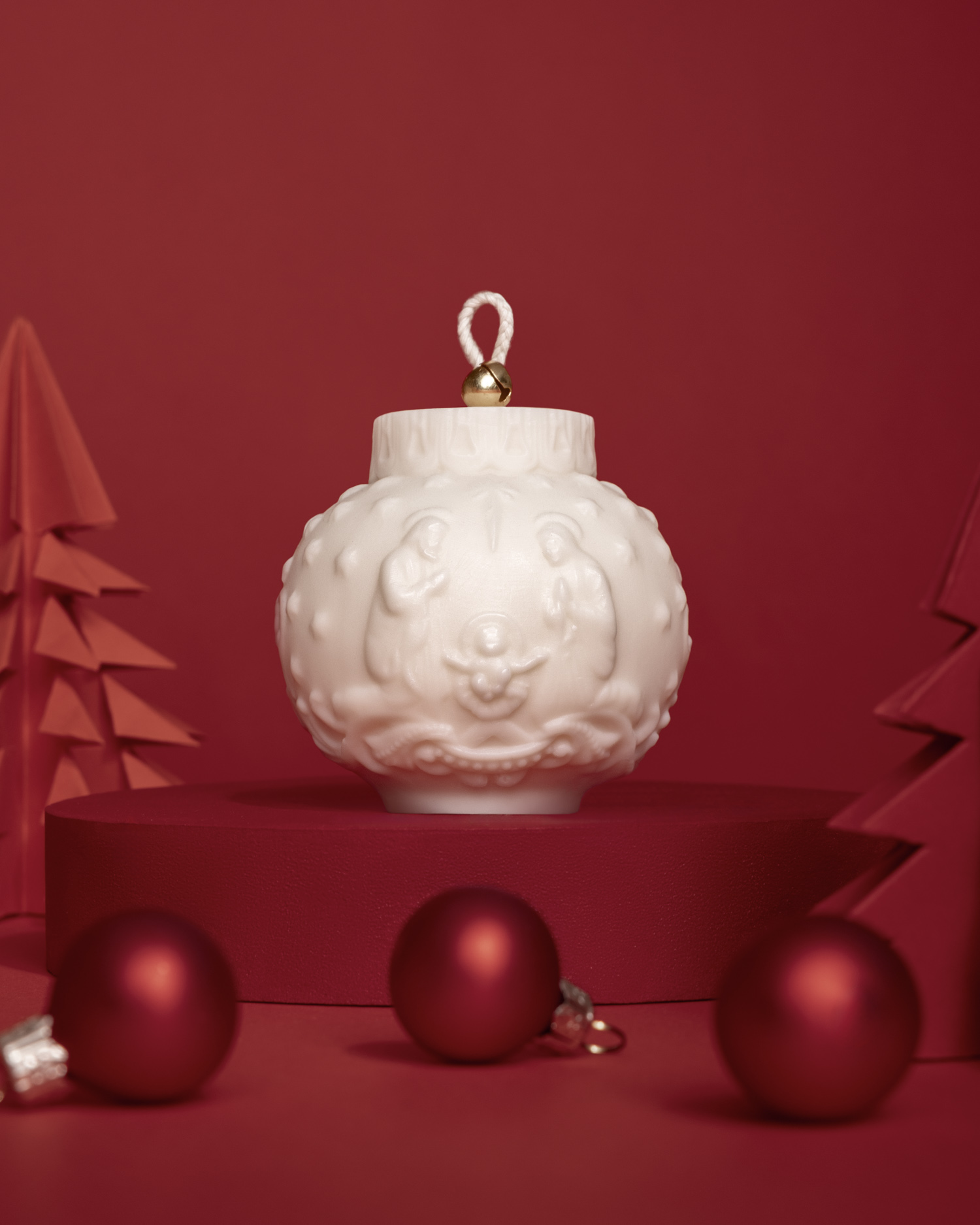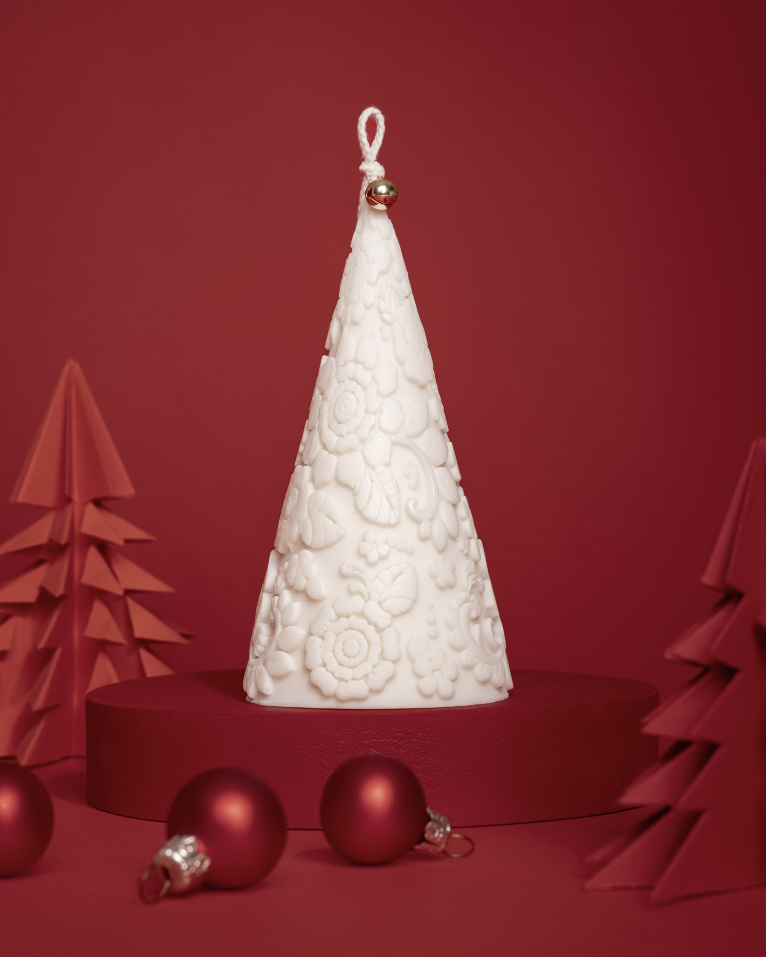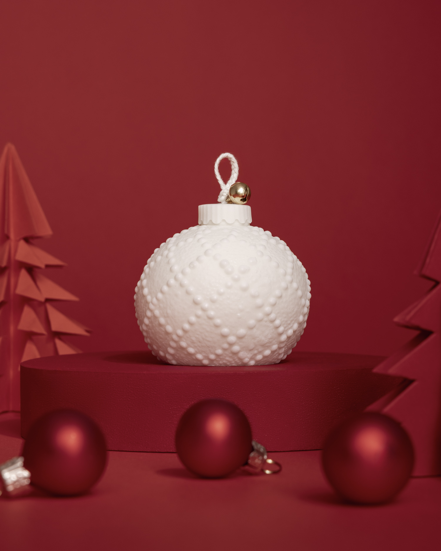 Dla świec bożonarodzeniowych przygotowałam wyjątkową, ciepłą scenę. Czerwone tło, piankowy podest pomalowany własnoręcznie oraz papierowe choinki stworzyły klimat świątecznej magii. To właśnie tu fotografia świec nabrała emocjonalnego charakteru.